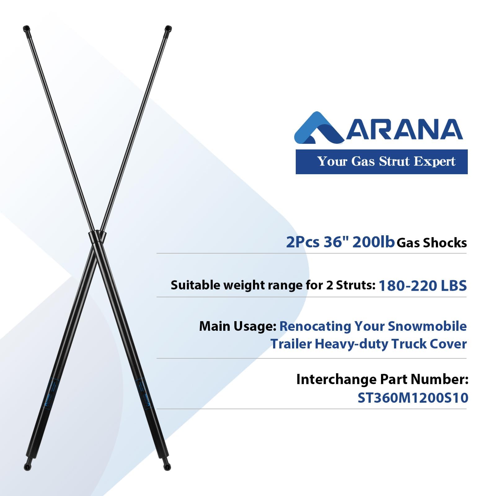 - Multi-scenario Usage: ARANA 36" gas struts are widely used on your snowmobile trailer, sled trailer cap, trailer lid, heavy-duty truck cover, trap door, tonneau cover those need long-size replacement struts, as long as the lid weight is between 180-220 pounds