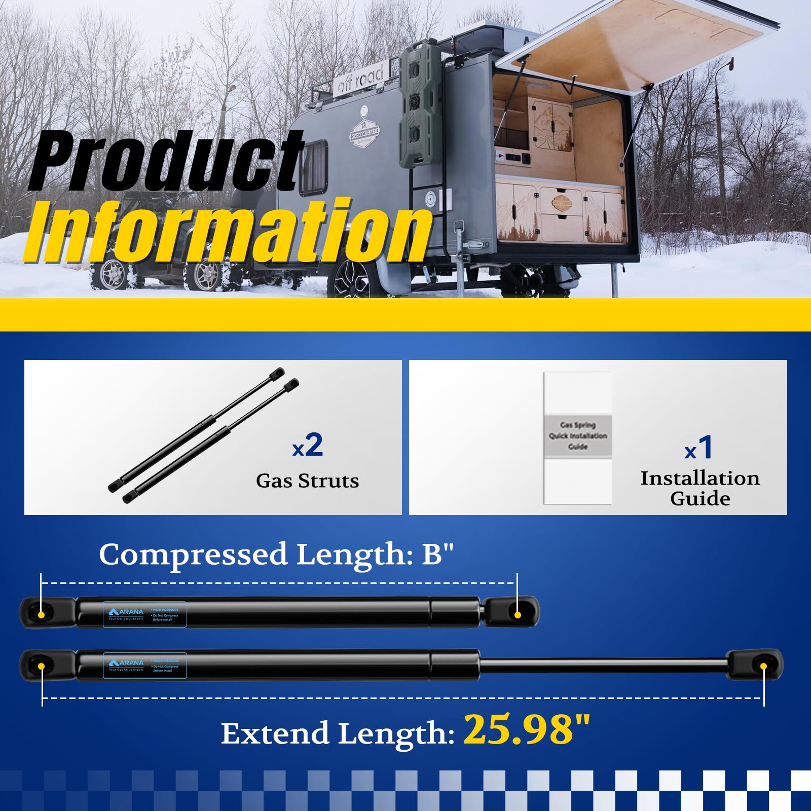 - 26 inch gas spring - Extended Length A (Center-to-Center): 25.98 inch (660 mm); Force 534N/120Lb Per Strut, 2 Struts Per Pair